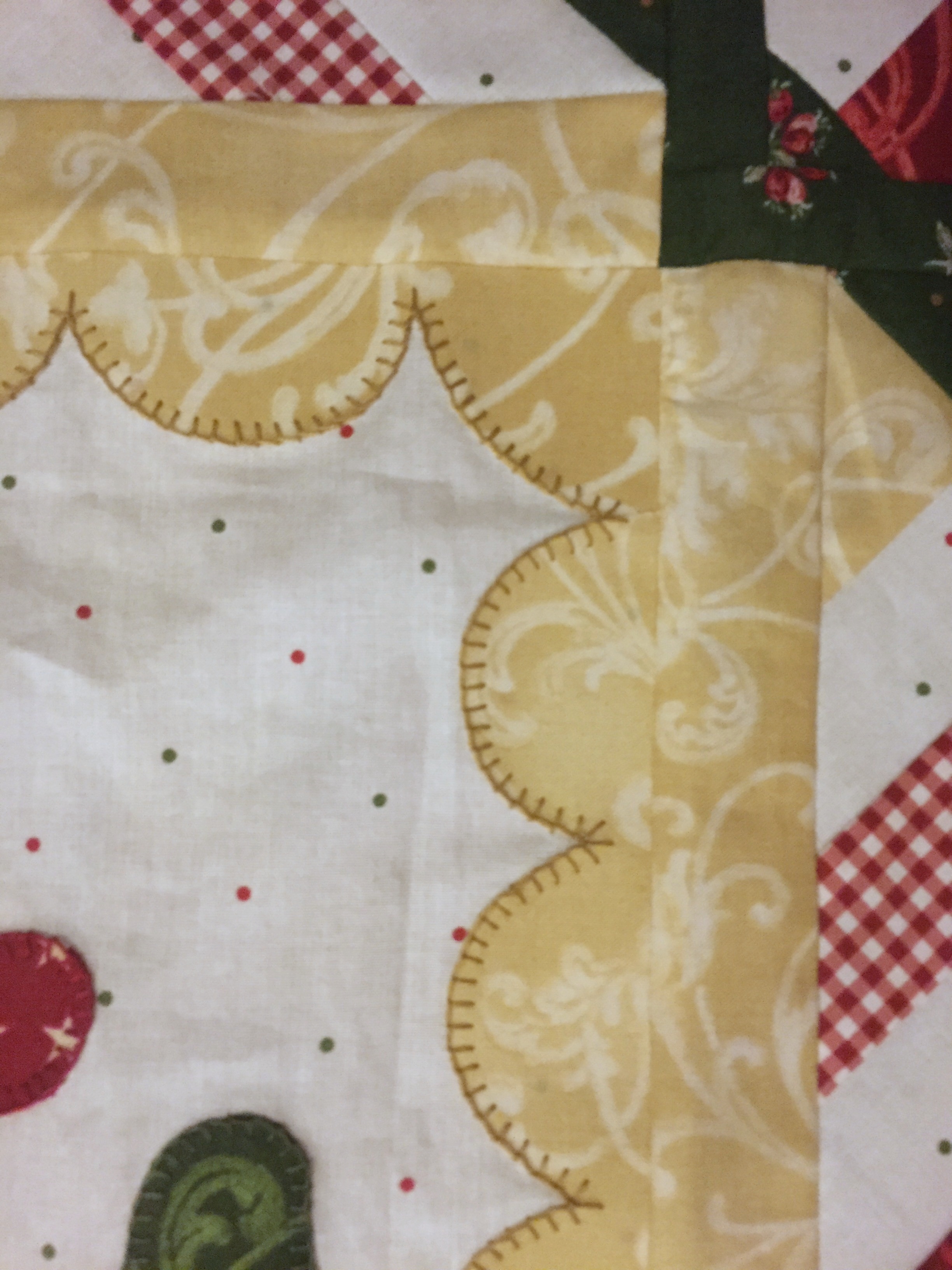 - Measure. Measure. Measure. I tell clients all the time when it comes to borders to measure, measure, measure. Another disadvantage of the interfacing – the scalloped edge stiffened the fabric where it had NO movement and so the border didn’t work well with the directions measurements. I had to put an easing stitch along the entire edge of the border to ease it to fit the main blocks. No gathers or puckers but time consuming. The borders were made as a unit – difficult to adjust beforehand, but I probably could have figured it out if I had measured first. I’m working on another Block of the Month quilt – no embroidery or embellishments. The directions call for measuring & squaring the smaller blocks withing the blocks as you go. I wish this quilt had done that a bit more. Lesson learned: measure, measure, measure.