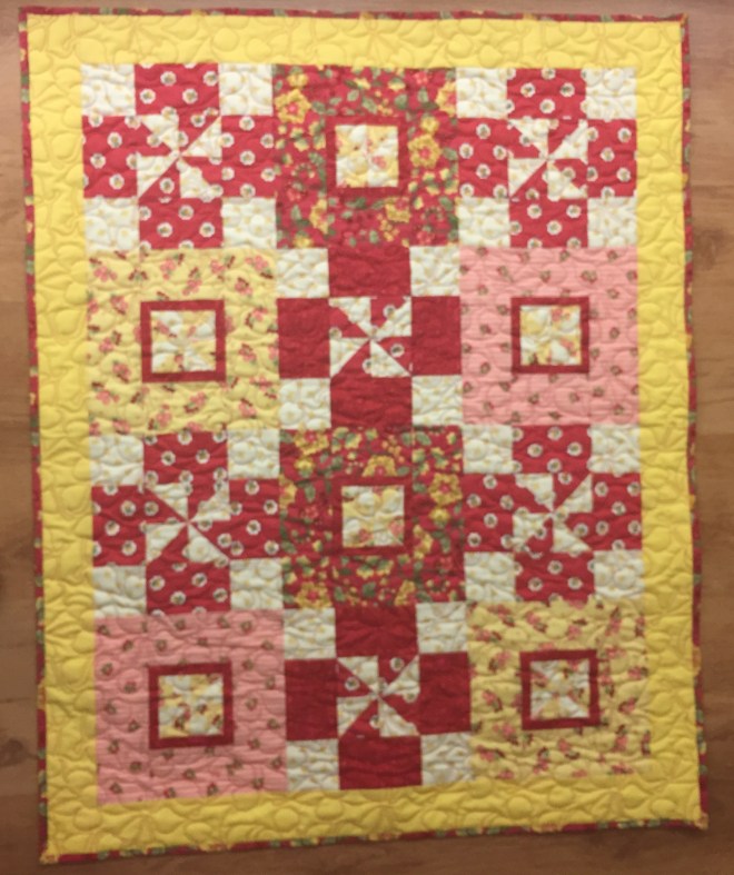 For almost 5 years I kept the leftover scraps together – because there were that many! Recently I finally made a very scrappy baby quilt for my great niece.